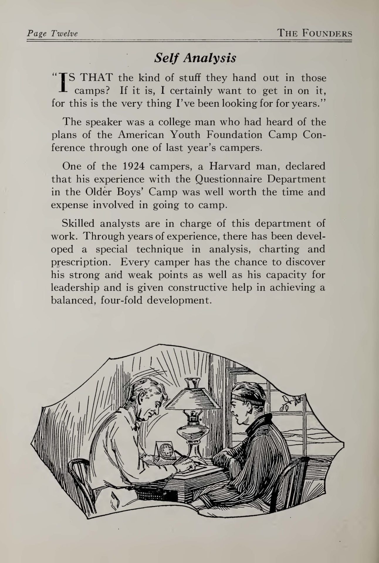 Camper comrades, isn’t it great to have an X-ray taken of our characters and then be able to develop them in the four-fold way? If it weren’t for the questionnaire department at camp, which is experienced along this line of character analysis, we would all probably go through life as ordinarily as anyone, but NO FOUNDERS DO. After our interviews with the questionnaire staff we are told of our weaknesses and prescriptions are given us to fulfill during the year.Indeed, it’s worth it. Not only are we more capable and active at camp the next year, but our whole lives, full and broad as they may be, are due to those prescriptions which encouraged us to enlarge our visions to accomplish more and greater things. [15]