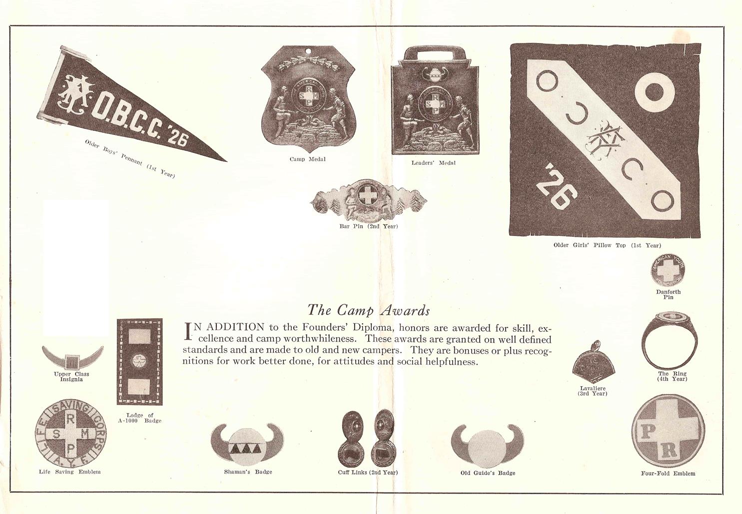 Emblems and awards from the 1920 camping season. The MPRS emblem appears in the lower right-hand corner.