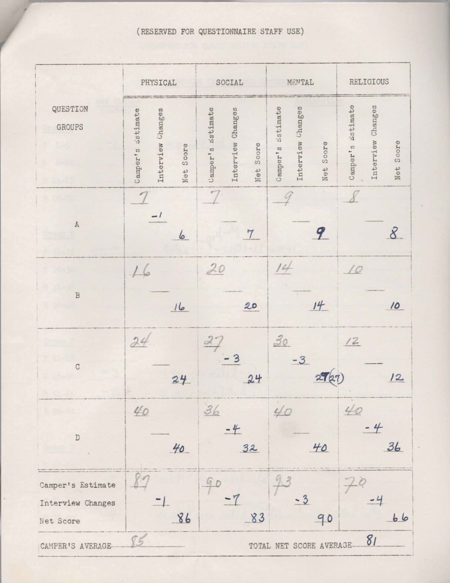 In this focused, one-on-one conversation, the camper and the interviewer would review the camper’s questionnaire, discuss the survey results, and in most cases, refine the scores through a detailed discussion of the camper’s daily practices, aspirations, and activities. The 1944 scoring worksheet shows three sets of numbers: the camper’s initial scores, the interviewer’s adjusted scoring, and the third, final result for each of the M, P, R, and S categories.