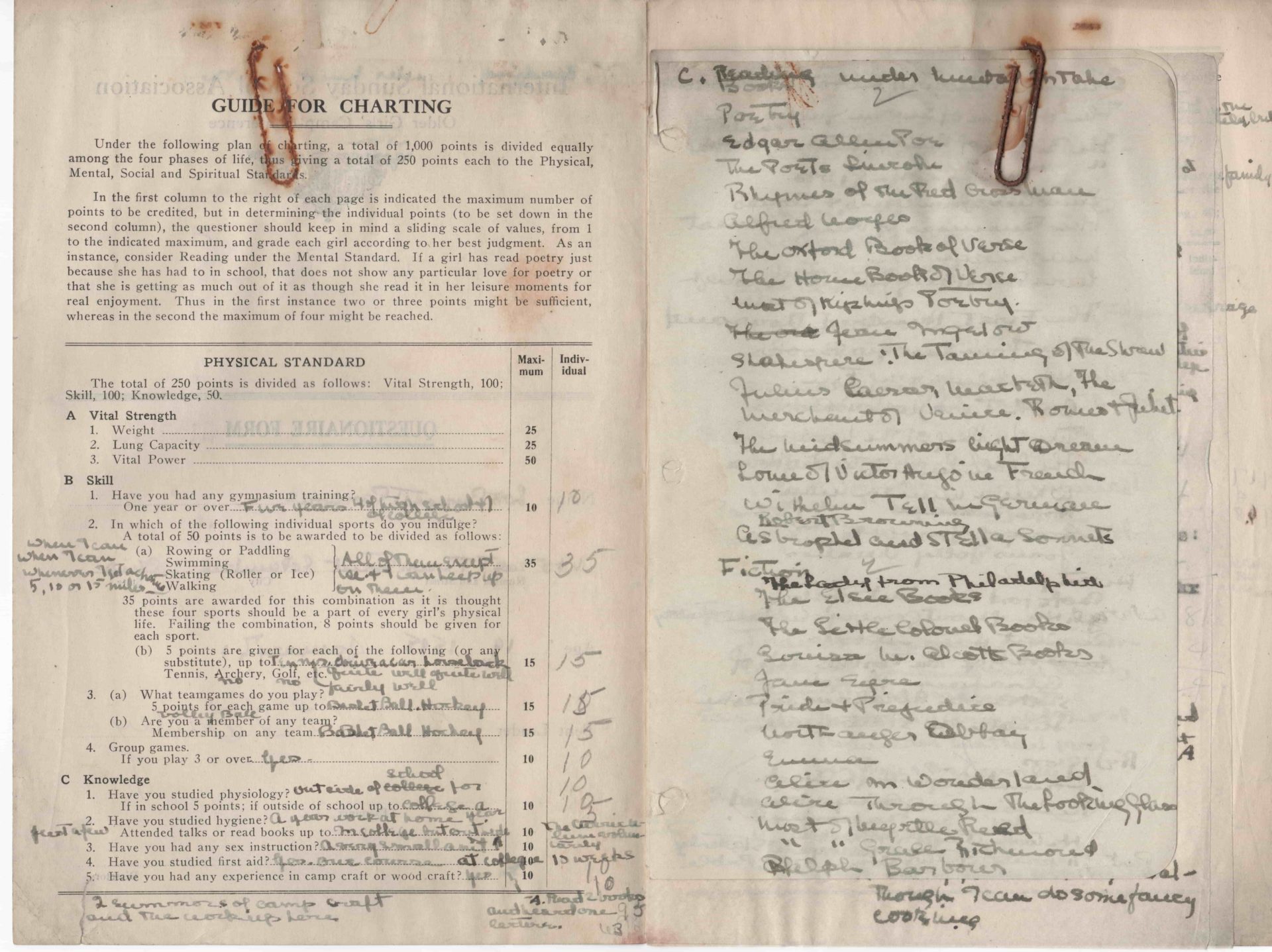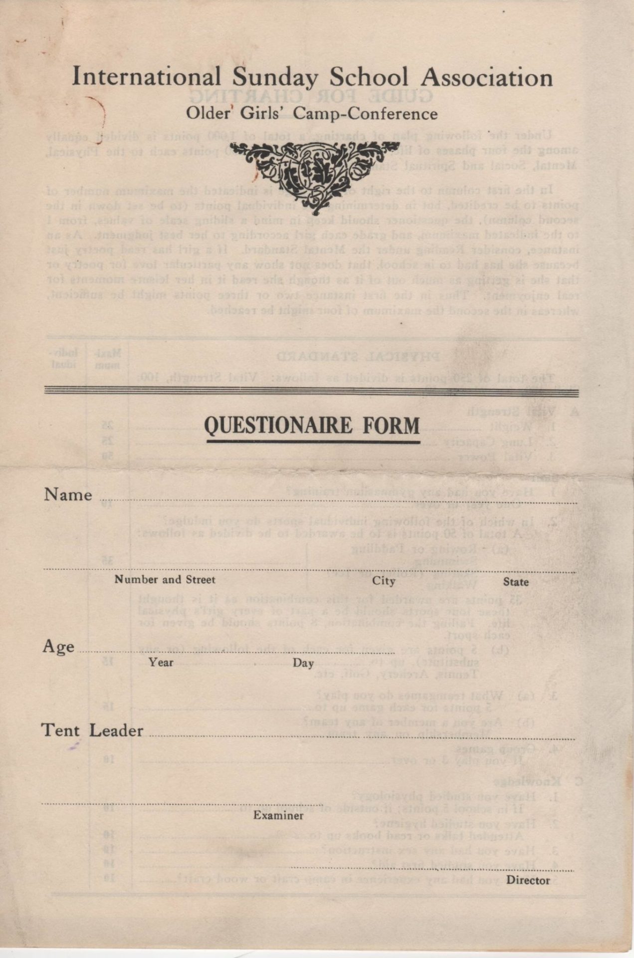 “The genius of the camp-questionnaire is the picturing of the individual character through the more or less spontaneous activities growing out of choice. The answers to questions covering the physical, social, mental, and religious expressions of the spiritual life reveal the individual’s inner urges, which are so indicative of the real character.”[16]